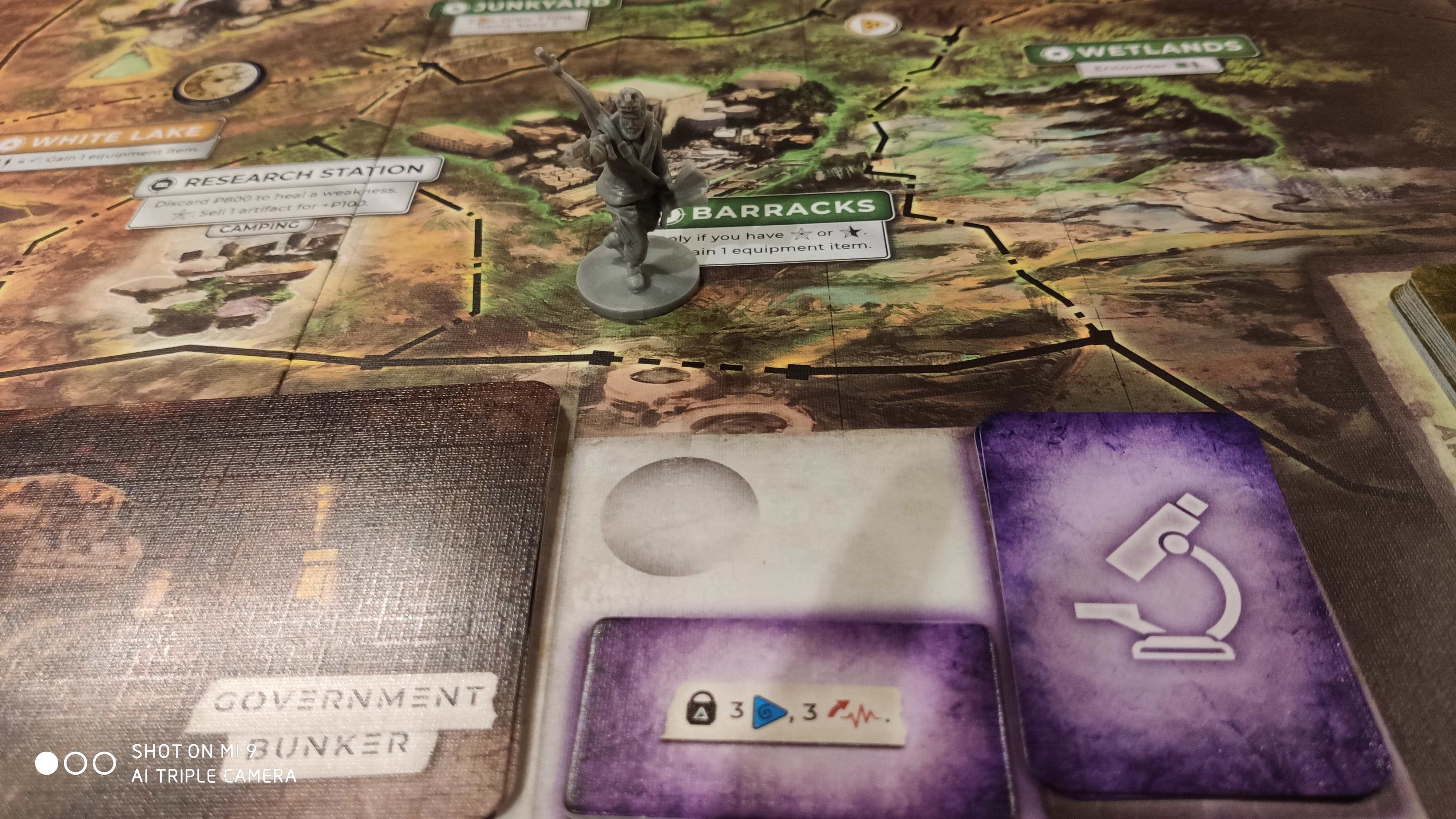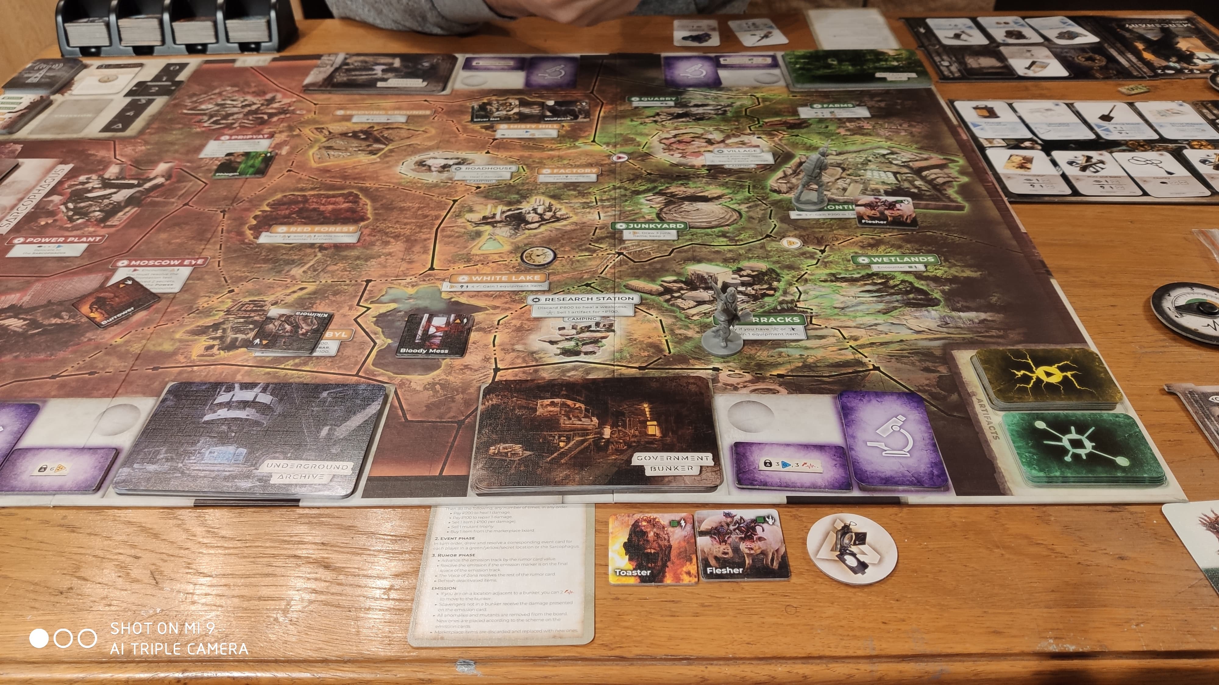 Die Spielmechanik hat uns sehr an Arkham Horror erinnert. Die einzelnen Phasen, besonders die ortsgebundenen Events sind sehr ähnlich. Jedoch muss ich zugeben, dass ich diese Mechanik bei Zona besser durchdacht finde als bei Arkham Horror (und dies obwohl ich ein riesen Arkham Horror Fan bin). Die Events sind durch die zusätzliche Reputation, also Gesinnung, sehr abwechslungsreich. Außerdem gibt es viele Events, bei denen man sich für eine Möglichkeit entscheiden kann, ähnlich wie beim Fallout Boardgame. Auch die Mutanten- und Anomalien-Tokens haben am Anfang sehr an Arkham Horror erinnert. Jedoch sind auch diese in Zona besser durchdacht, da alle Werte auf der Rückseite stehen und man somit die Extra-Fähigkeiten nicht übersehen kann.