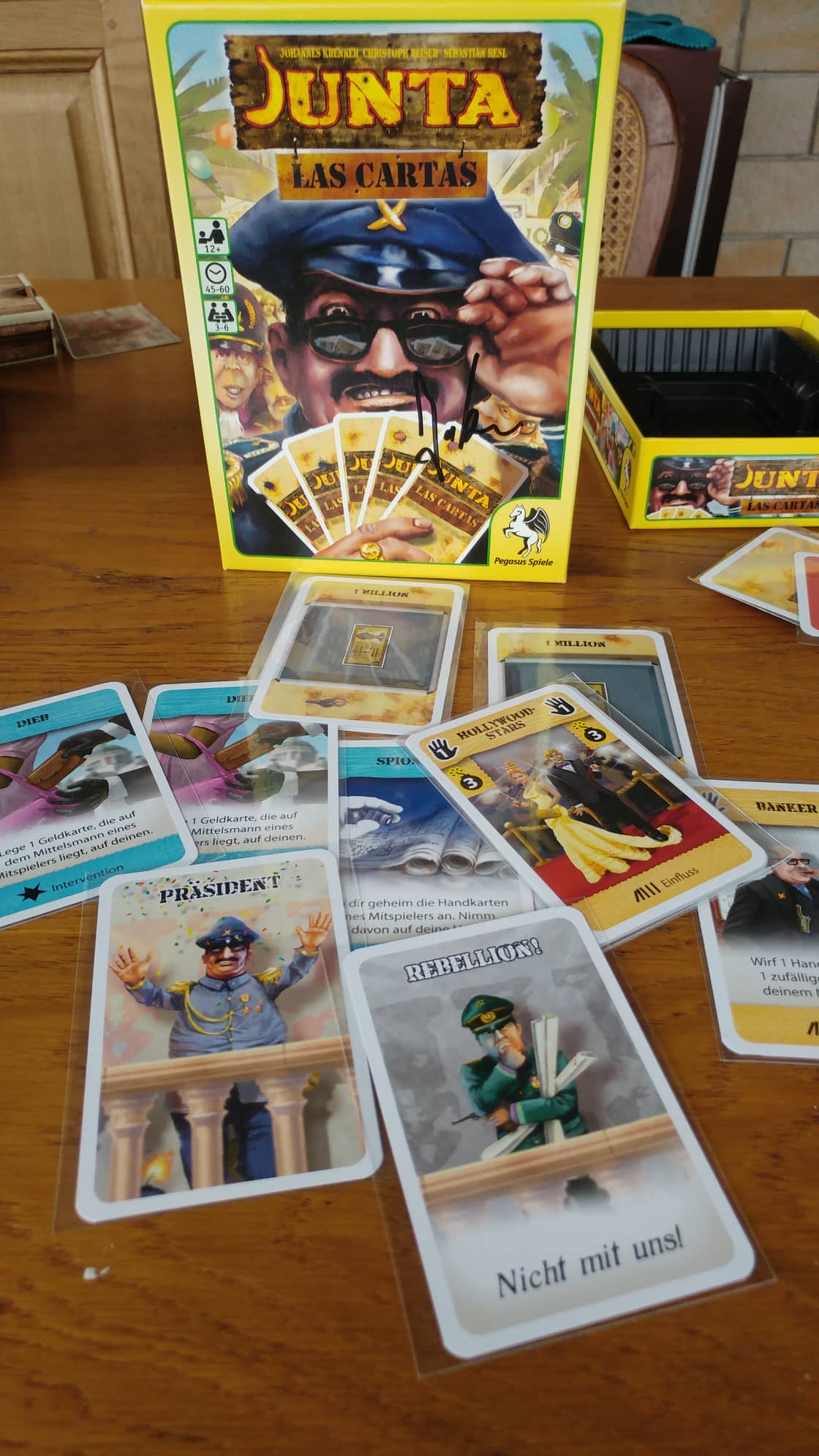 Last but not least haben wir noch Junta Las Cartas, ein Kartenspiel für 3-6 Personen, bei dem sich jeder einmal als Präsident fühlen kann. Der Präsident entscheidet über das Budget und wer wie viel davon abbekommt. Ist man nicht zufrieden mit seinem Teil, kann man eine Rebellion anzetteln und den Präsidenten stürzen. Gelingt das, kriegt man nicht nur einen Teil des Geldes vom Präsidenten, sondern auch sofort sein Amt. Jetzt kann man beweisen, ob man der bessere Präsident ist. Gewonnen hat der Spieler mit dem meisten Geld.
