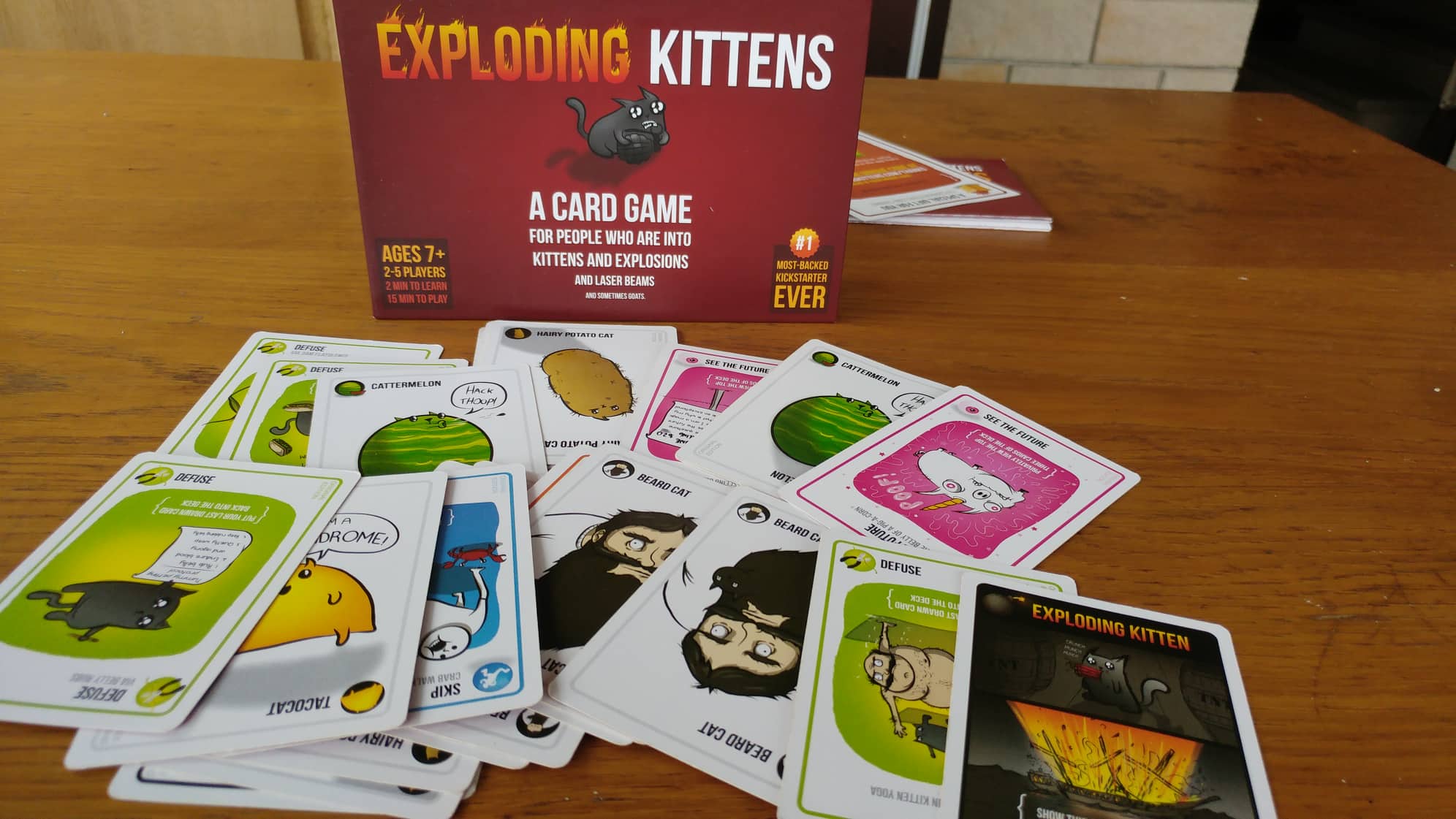 Exploding Kittens ist ein schnelles Kartenspiel für 2-5 Spieler, bei dem jeder die Rolle einer schrägen Katze einnimmt. Durch die Erweiterung Imploding Kittens kann man das Spiel auch mit bis zu 6 Leuten spielen. Man muss jede Runde eine Karte nachziehen und dabei hoffen, dass man nicht durch eine Bombe explodiert. Zieht man doch mal eine Bombe kann man diese eventuell entschärfen, wenn man eine Entschärfungskarte auf der Hand hat. Das Spiel bietet viele verschiedene Karten, die einem es erlauben anderen Katzen zu schaden, den Stapel neu zu mischen oder auch einfach übersprungen zu werden. Gewinner ist die letzte lebende Katze.