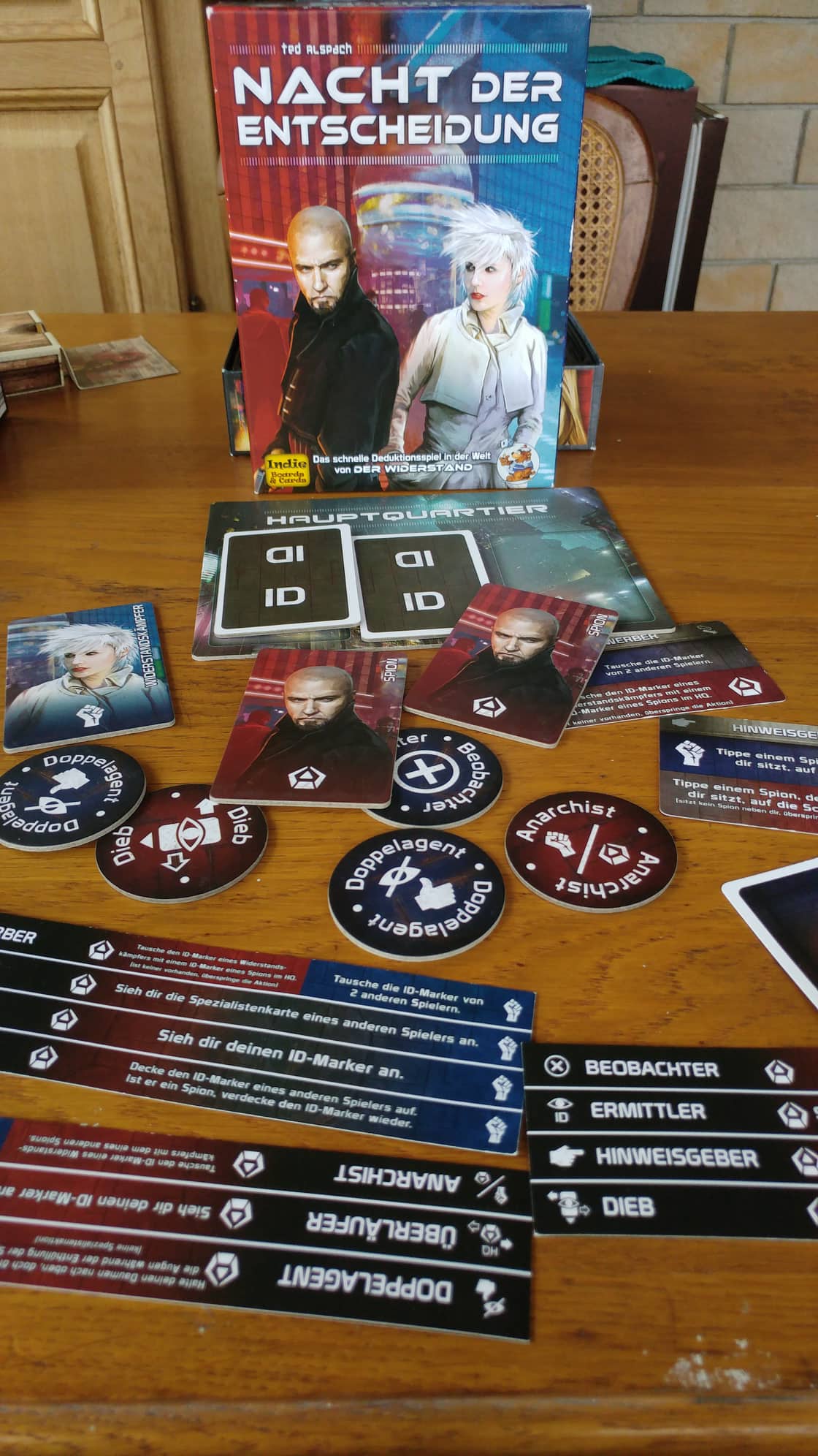 Nacht der Entscheidung ist ein Deduktionsspiel für 3-10 Spieler, das im Universum von Der Widerstand spielt. Das Spielprinzip ist sehr ähnlich, wie bei One night Ultimate Werewolf und trotzdem etwas komplexer. Jeder Spieler kriegt eine Rollenkarte, sprich er spielt einen Widerstandskämpfer oder einen Spion. Außerdem bekommt er ein Talent, was er innerhalb der Nachtphase durchführen muss. Die Rollenkarten und Talente muss man wieder geheim halten. Die meisten Talente unterscheiden sich je nach Rolle die man am Anfang zugeteilt hat. So macht ein Spion, der die Diebfähigkeit hat nicht dasselbe wie ein Widerstandskämpfer. Nach der Nachtphase muss abgestimmt werden, wo die Spione sitzen. Bei diesem Spiel ist es also wichtig sich die Talente äußerst gut anzusehen und einzuprägen: Als Spion gibt man zwar vielleicht sein richtiges Talent bekannt, behauptet natürlich aber die Aktion des Widerstandskämpfers gemacht zu haben, da man sich ja nicht entlarven will. Auch hier darf man sich die Rollenkarten nur am Anfang des Spiels ansehen, da sie eventuell vertauscht werden.