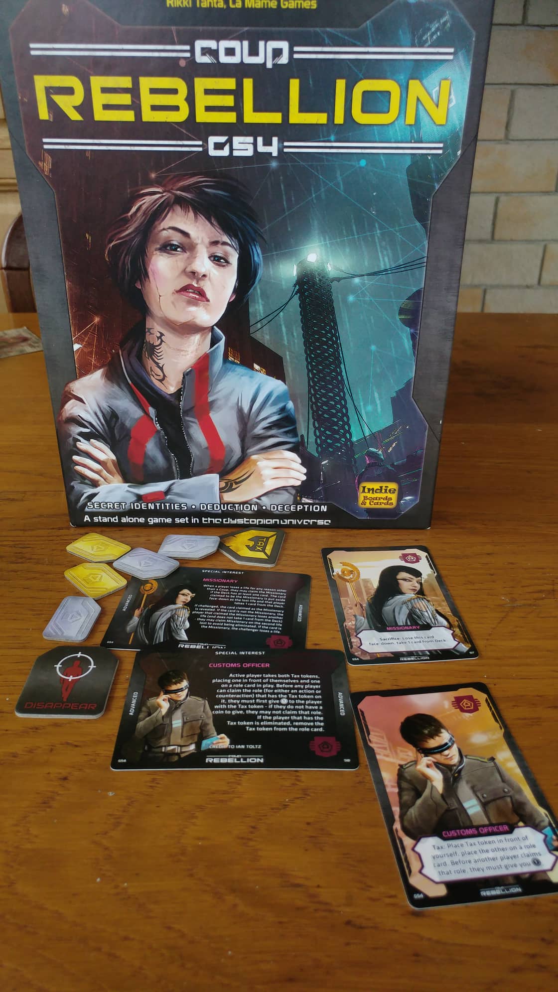Coup: Rebellion G54 ist ein schnelles Kartenspiel für 3-6 Spieler im Universum von der Widerstand. Als erstes bekommt jeder Spieler 2 Handkarten. Diese zwei Handkarten stehen dabei auch für seine 2 Leben. Muss ein Spieler durch eine Aktion die letzte seiner Handkarten offen auslegen ist er ausgeschieden. Die zwei Handkarten zeigen jeweils eine Rolle. Jede Rolle hat eine eigene Aktion die man durchführen kann. Ist ein Spieler am Zug kann er einfach behaupten eine gewisse Person zu sein und seine Aktion zu nutzen. Dabei darf er natürlich lügen. Glaubt ein anderer Spieler ihm dies nicht kann er ihn herausfordern und er muss die angegebene Rolle offenbaren. Hat er gelogen und sich als jemand anderen ausgegeben verliert er ein Leben. Außerdem kann man Spieler anhand eines Coup töten. Ziel des Spiel ist es als einziger zu überleben.