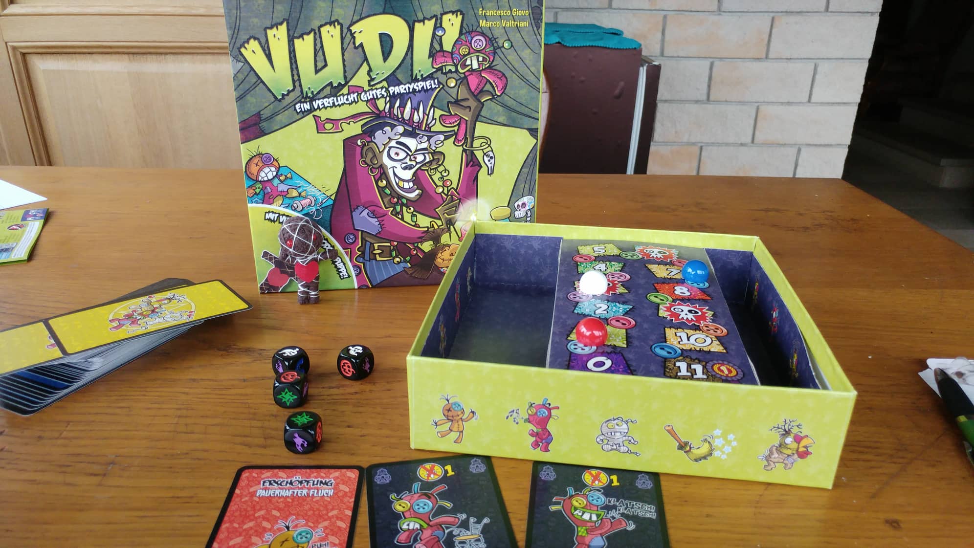 Spiel für 3-6 Spiele bei dem es darum geht die anderen Spieler zu verfluchen. Jeder Spieler kann Flüche lernen und durch ausgeben der notwendigen Kosten, Flüche wirken lassen. Dafür muss er den Namen des Opfers und des Fluches mit viel Gestikulation rufen. Der verfluchte Spieler muss sich nun an diesen Fluch halten, zum Beispiel: die Ellenbogen müssen sich während des gesamten Spiels berühren. Schafft er es nicht diesen Fluch einzuhalten kriegt der Vudumeister einen Punkt. Jedoch muss jeder Spieler sich merken, wen er mit welchem Fluch getroffen hat. Fällt es ihm nicht auf, dass eines seiner Opfer sich nicht daran hält, hat er Pech.
