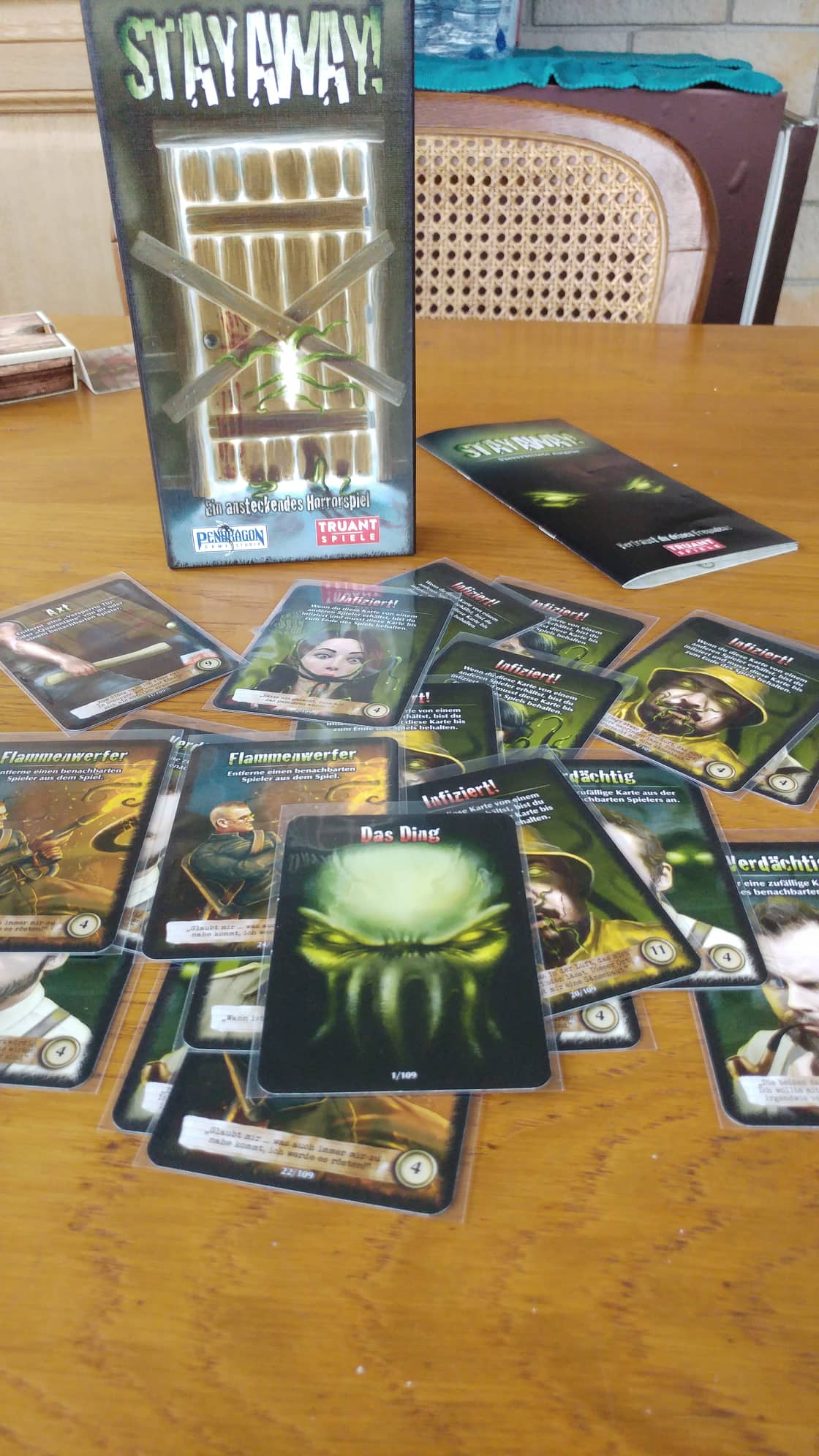 Mit Stay Away, ein Kartenspiel für 4-12 Spieler, haben wir nun auch das letzte Deduktionsspiel unserer Liste erreicht. Bei Stay Away ist anfangs ein Spieler Das Ding und alle anderen Menschen. Keiner kennt die Rolle der anderen Mitspieler. Hier muss man jede Runde eine Karte ziehen, eine verdeckt abwerfen oder ein Effekt ausführen und dann eine Karte mit dem nächsten Spieler tauschen. Doch Vorsicht: Sitzt das Ding neben dir kann es dir eine Infiziertenkarte geben. Nun bist du kein Mensch mehr sondern spielst zusammen mit dem Ding. Die Menschen können das Ding jedoch mit einem Flammenwerfer töten und die Runde für sich entscheiden. Bei Stay Away muss man also durch Platzwechsel dem Ding hinterherjagen oder sich schnell in Sicherheit bringen.
