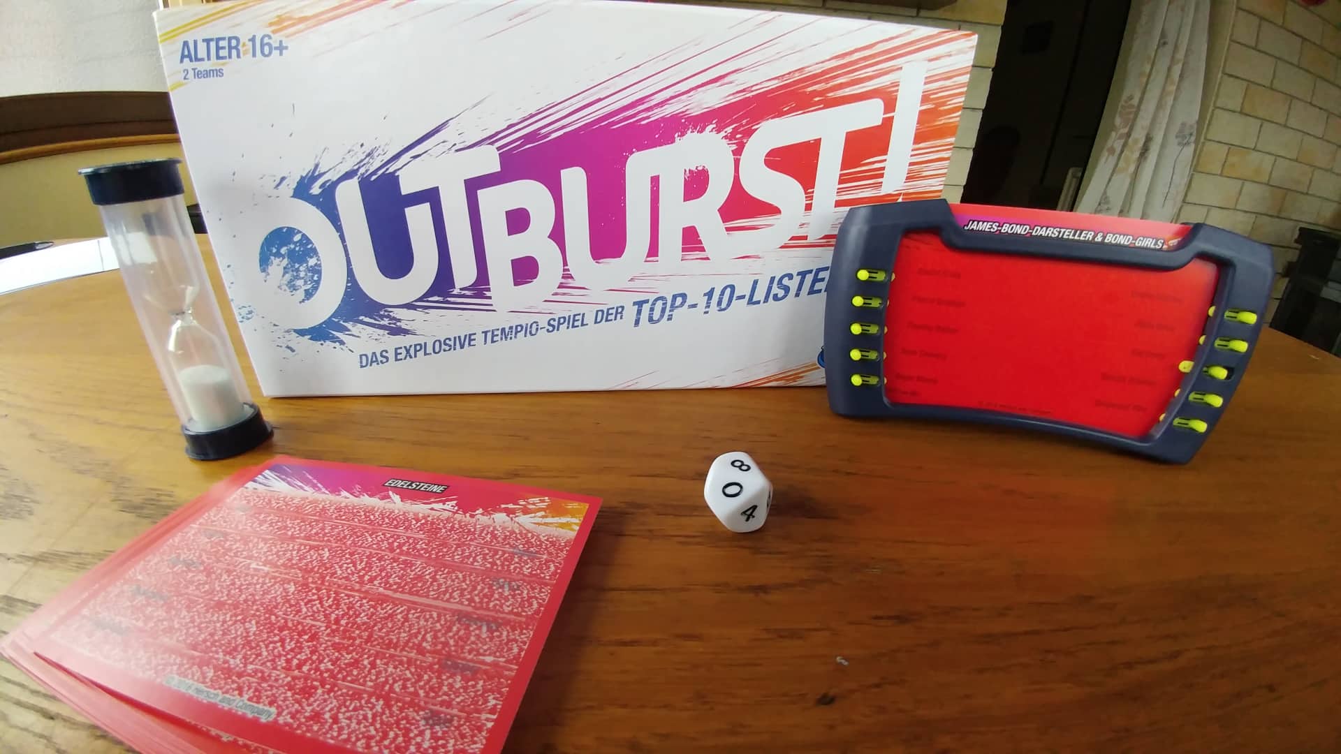 Outburst ist ein schnelles Ratespiel, indem man in zwei Teams gegeneinander antritt. Deswegen ist das Spiel auch ideal für größere Gruppen. In Outburst bekommt ein Team einen Oberbegriff, zum Beispiel alles was weiss ist, vorgelesen. Zu diesem müssen die Spieler möglichst viele Begriffe nennen. Die Herausforderung dabei ist es genau die zehn Begriffe zu nennen, die auch auf der Karte stehen. Mit dem Würfel kann man dann noch Bonuspunkte ergattern. Außerdem hat man 3 mal die Möglichkeit eine Frage zu schieben. Damit ist das gegnerische Team gezwungen diese Frage zu beantworten. Gewonnen hat das Team, das als erstes 60 Punkte erreicht hat.