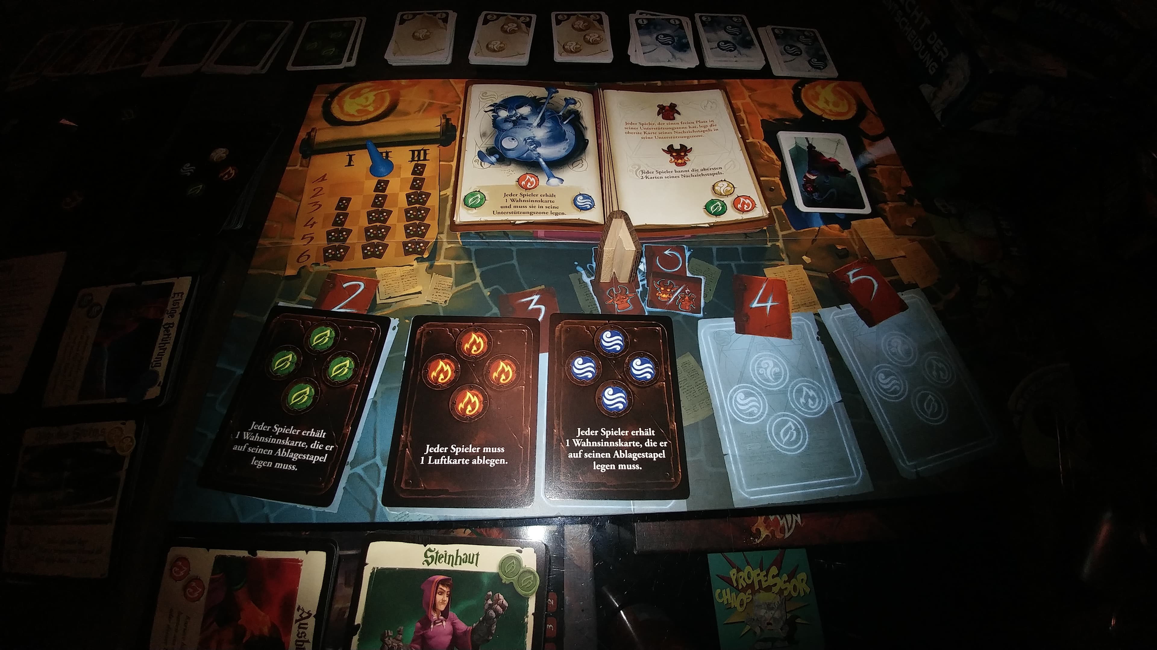 wou fir een ëmmer Kaarten am Wäert vu 4 vun engem Element brauch. Dofir ass et wichteg sech ëmmer erëm nei Kaarten ze kafen an sech sou säin eegent Deck ze bauen. Mee et muss e sech tommelen, well all Fluch trefft Zauberer wann si net schnell genuch sinn. Meeschtens kritt een doduerch Wahnsinnskaarten, déi en nëmme ganz schwéier lass gëtt. E Spiller deen nëmmen nach Wahnsinnskaarten op der Hand huet, ka leider net méi géint Monster kämpfen.