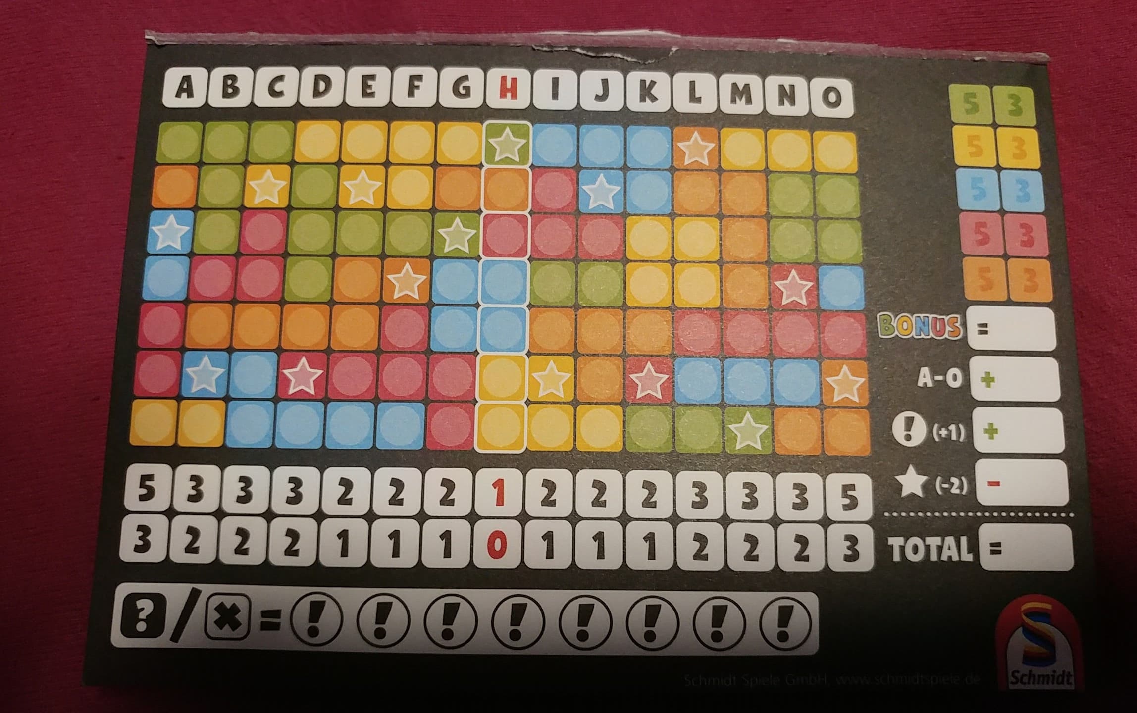 Um Enn vum Spill ginn dann nach Punkten ausgewäert: Dee Spiller deen eng komplett Spalt als éischt ugekräit huet erhält déi iewescht Punktzuel, déi ënnert dëser Spalt steet. All déi aner Spiller kennen just nach déi ënnescht Punktzuel erhalen, wann si et packen d'Spalt komplett unzekräizen. Ähnlech ass et bei de Faarwen: de Spiller deen als éischt all Feld vun enger Faarw ugekräizt huet erhält 5 Punkten, déi aner just nach 3 Punkten. Fir all Feld mat engem Stär, dat een net ugekräizt huet erhält een Strofpunkten; also -2 pro Stär. Fir all Joker deen een net notzt kritt een zousätzlech ee Punkt.